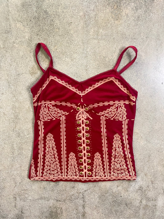 00's Burgundy Corset Print Spaghetti Strap Tank Top