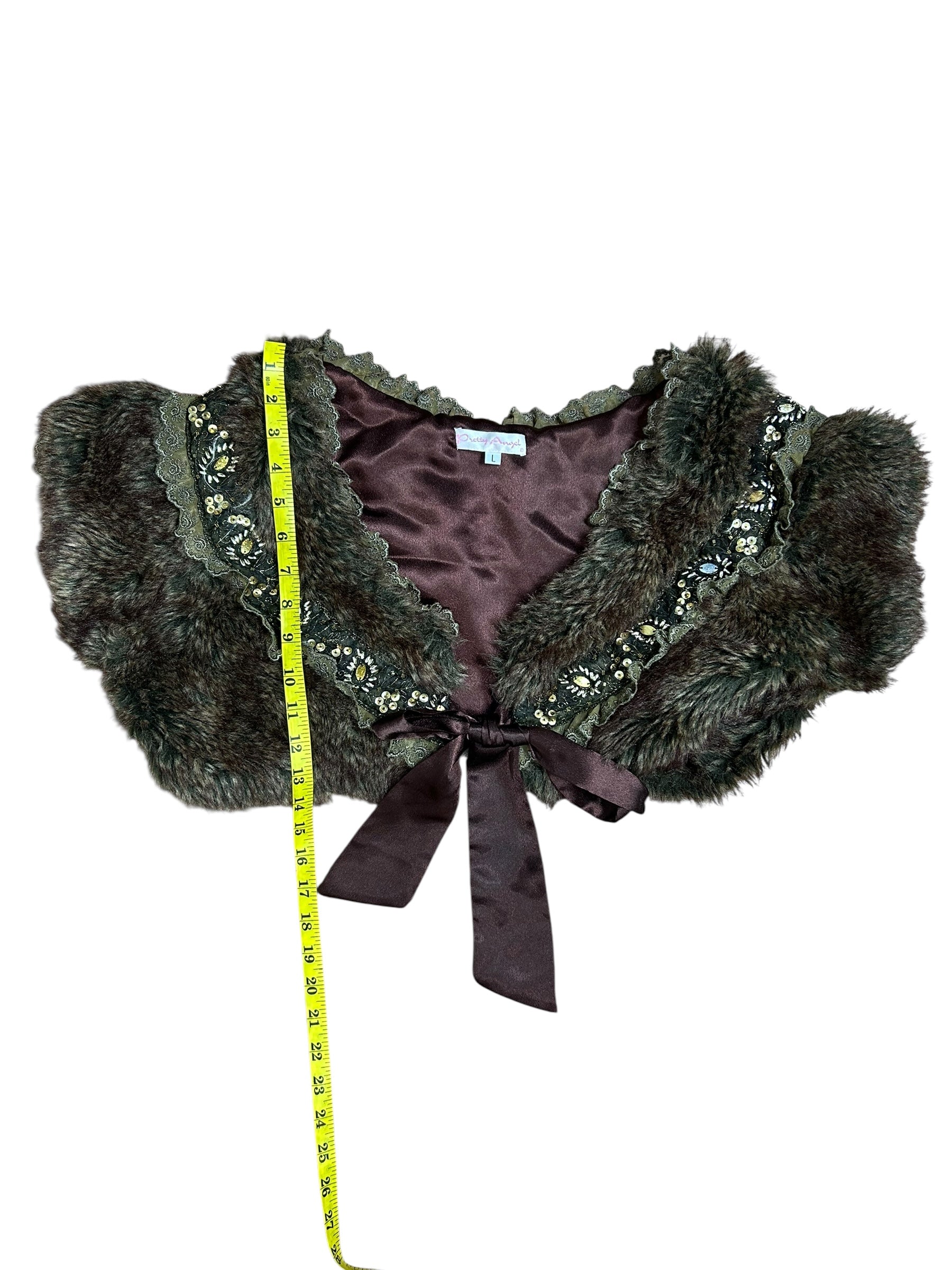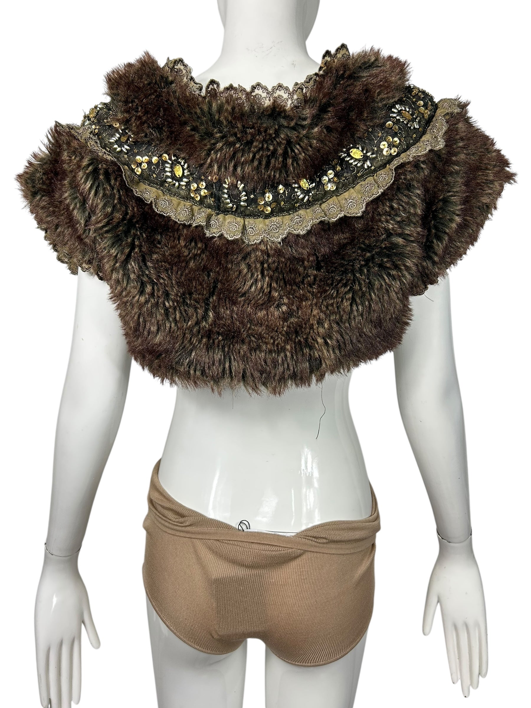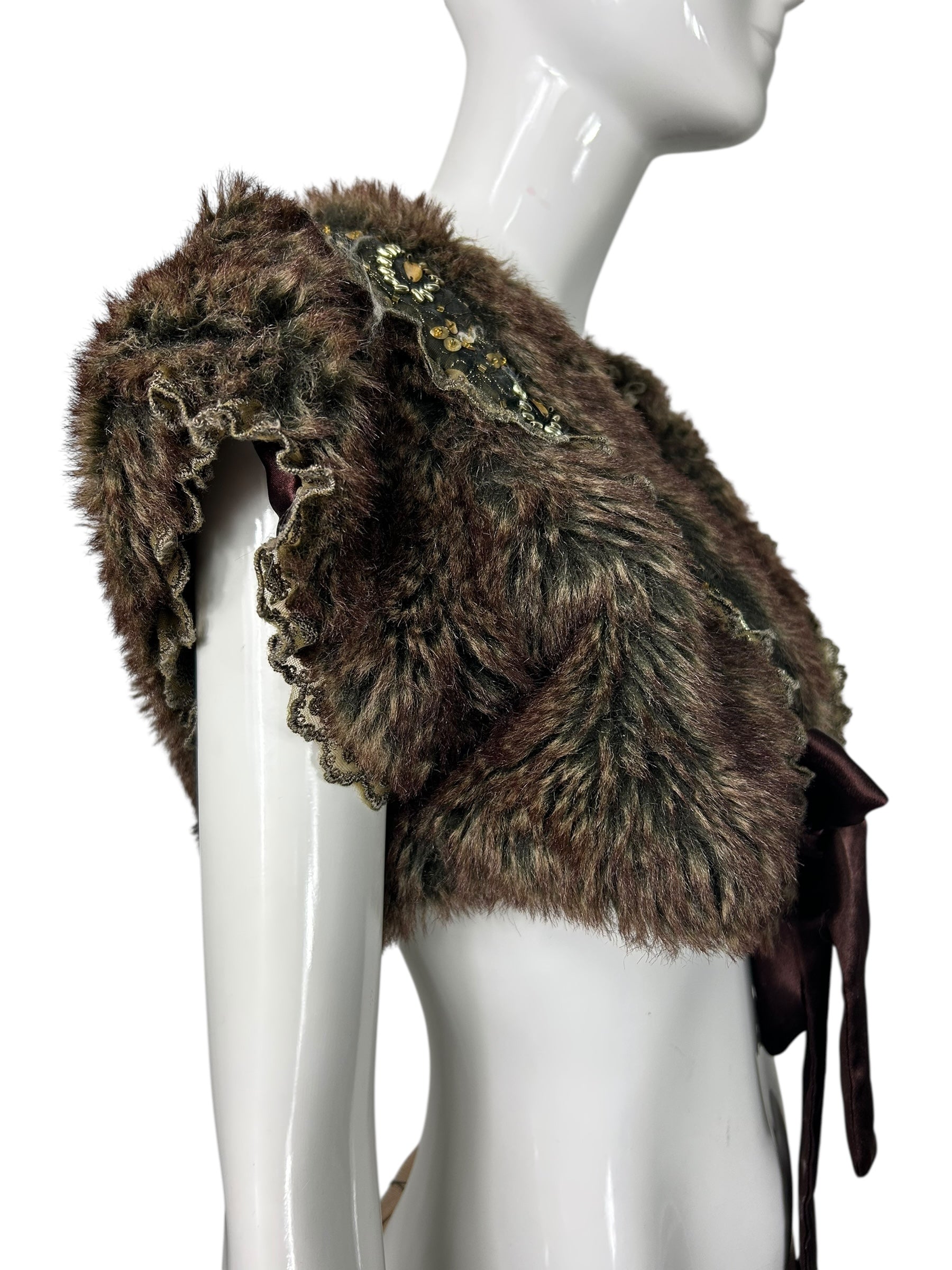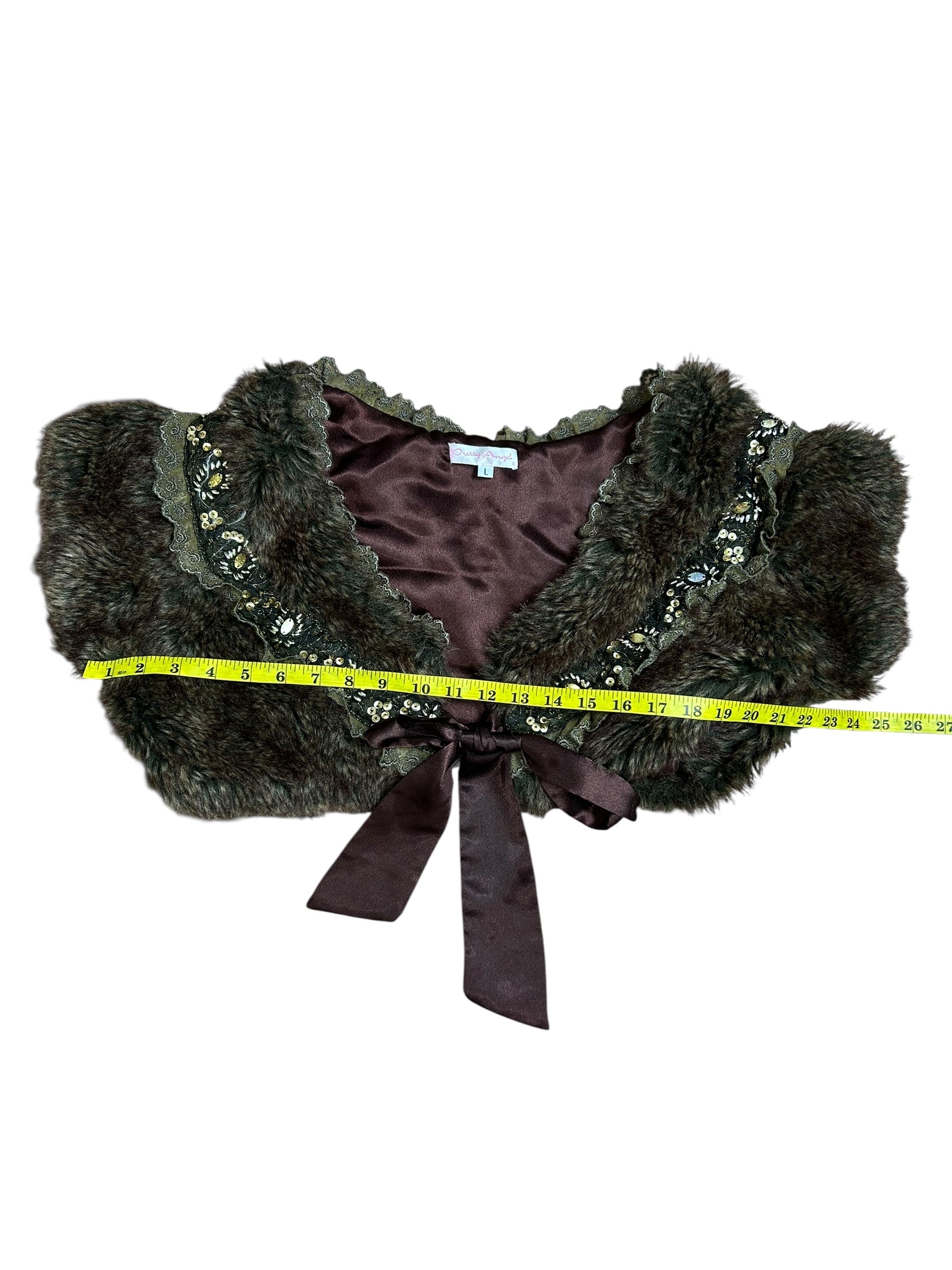 Cropped Fur Bolero with chocolate brown ribbon and lace trim with beaded detailing.