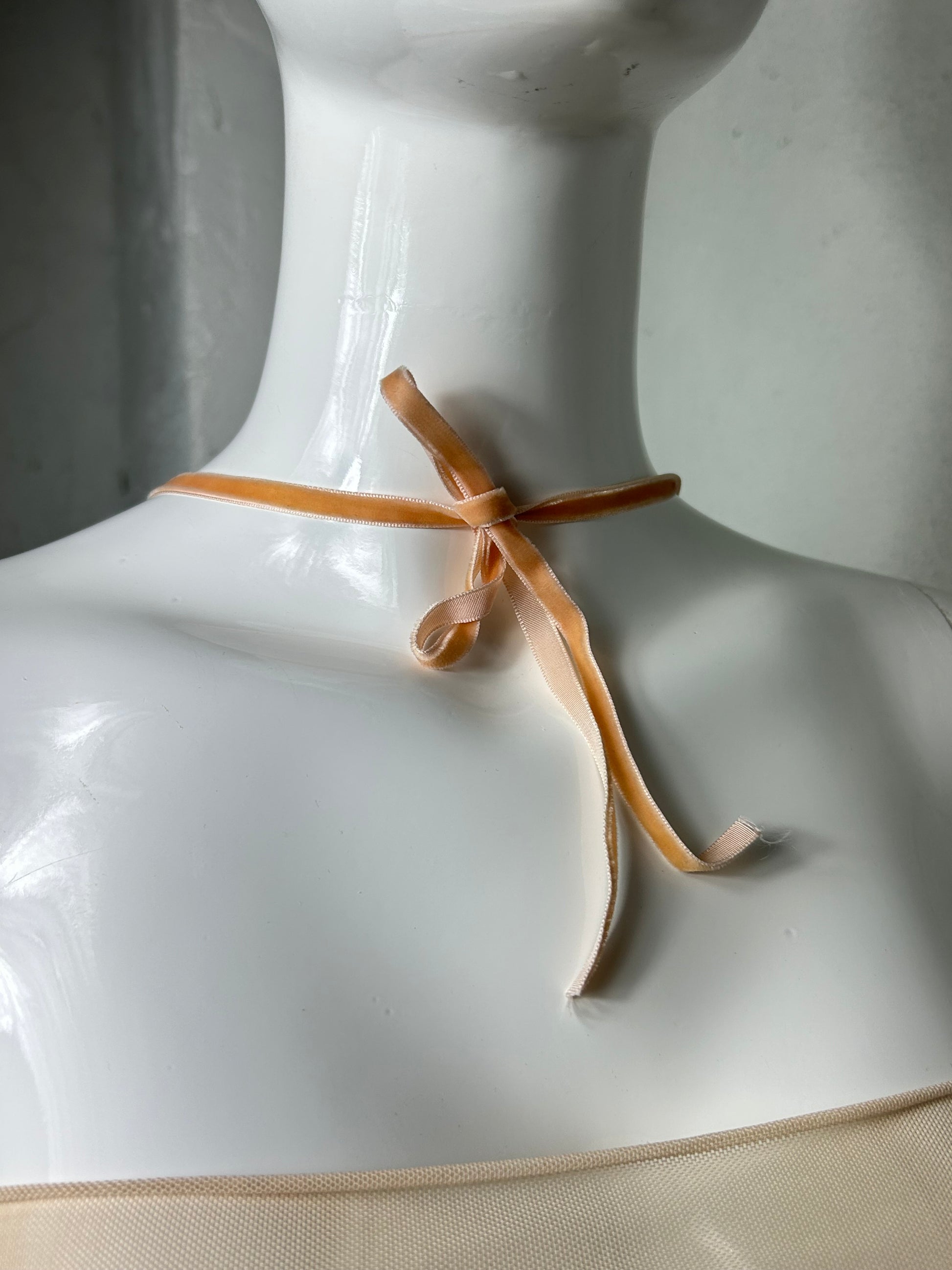 Velvet Beaded Cross Necklace. This soft goth piece features iridescent beads, a romantic cross, and a blush pink velvet ribbon. Perfect for adding a touch of whimsy to any outfit, especially when paired with silk or crepe materials.